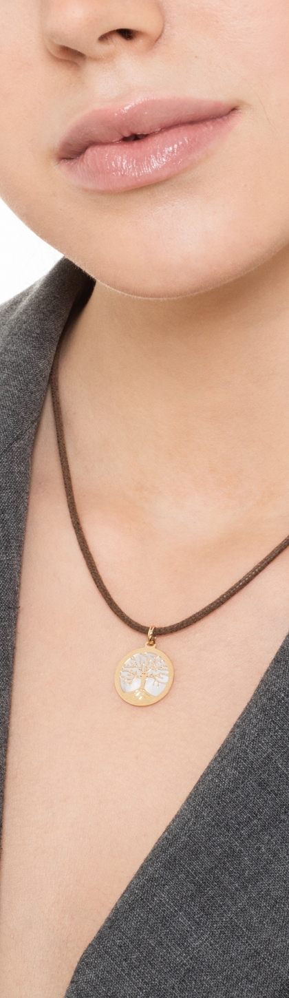 Pendentif raffiné en or jaune 18k représentant l'Arbre de Vie, délicatement posé sur un fond en nacre. Un symbole de force, de sagesse et de renouveau. Diamètre : 16,30 mm.