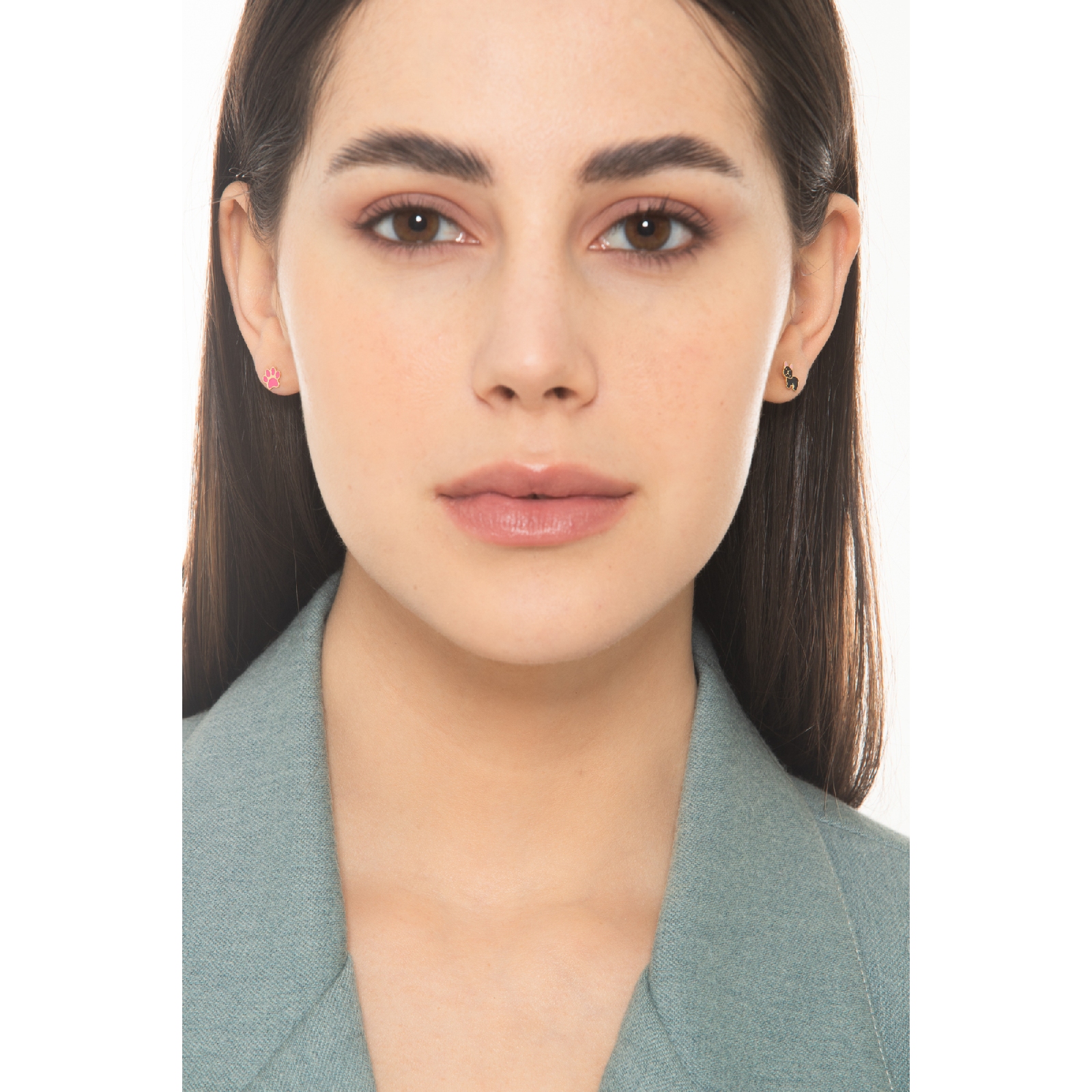 Boucles d’oreilles en or jaune 18k avec bulldog français et patte rose