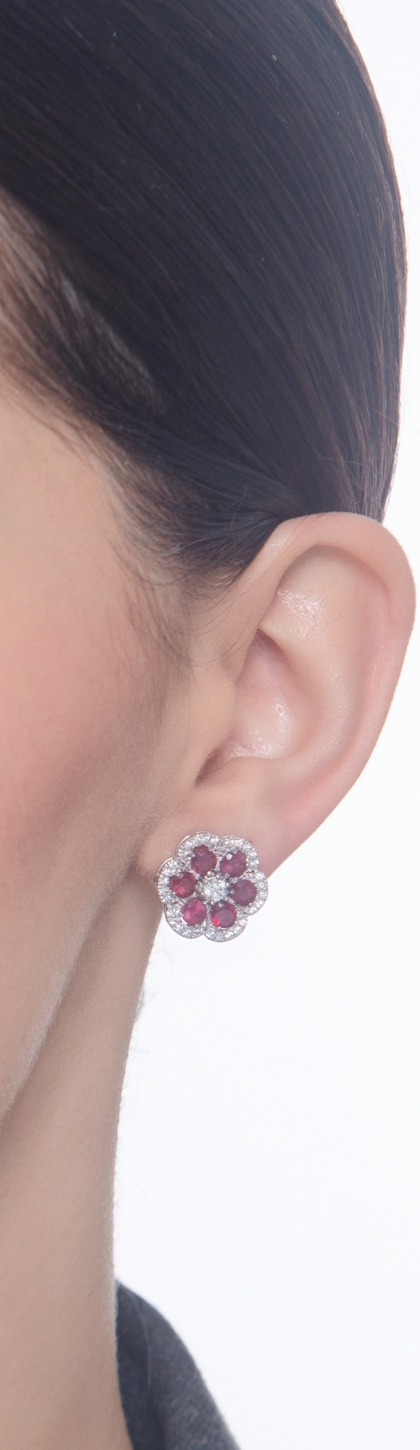 Boucles d'oreilles fleur avec Rubis et Diamants en Or Blanc 18k