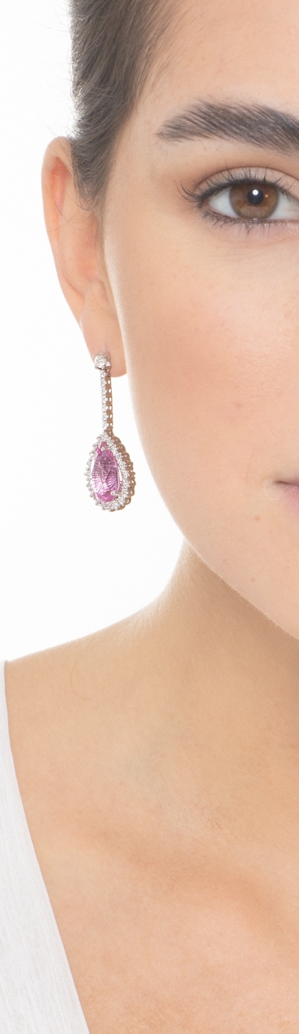 Boucles d’oreilles en or blanc 18k avec saphirs roses en forme de goutte d’environ 15x10 mm et diamants