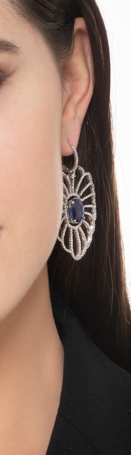 Boucles d’oreilles en or blanc 18k en diamants et saphir bleu central