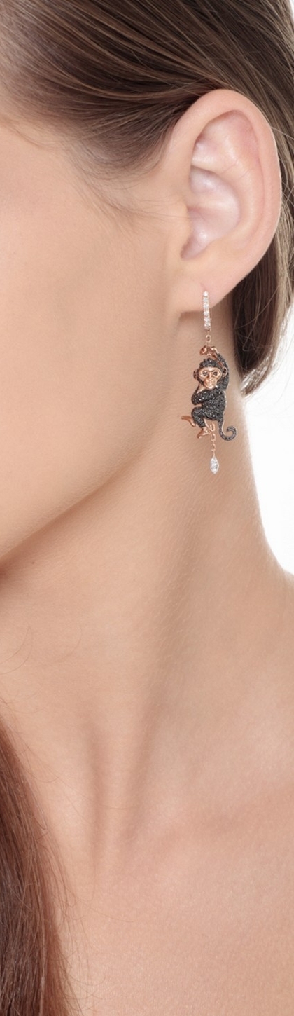 Boucles d’oreilles en or rose et blanc avec singes ornés de diamants noirs