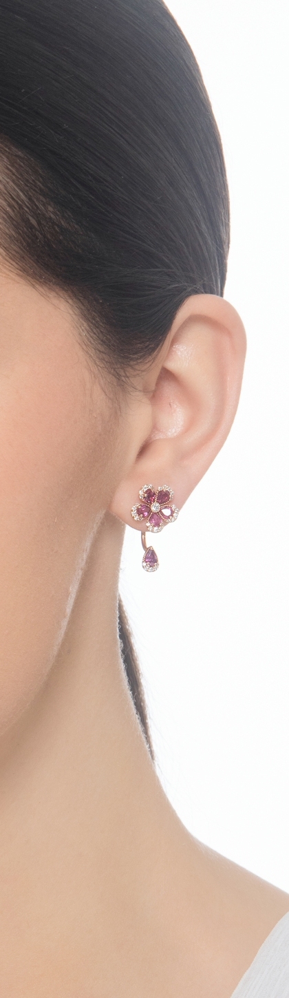 Boucles d’oreilles fleur or rose 18k avec rubis poire et diamants