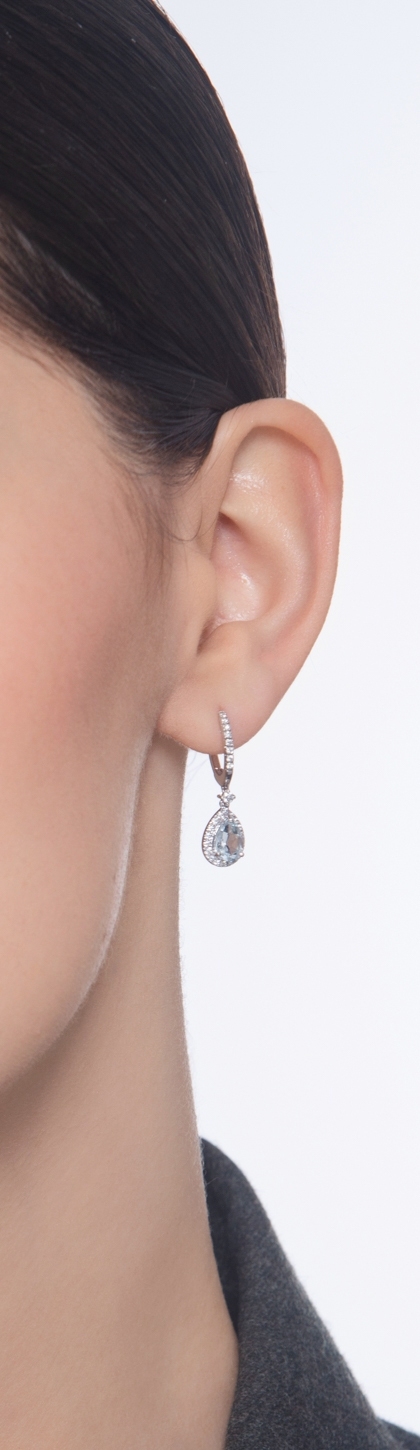 Élégantes et raffinées, ces boucles d'oreilles pendantes en or blanc 18k sont ornées d’une magnifique aigue-marine taille poire de 7x5 mm, sublimée par des diamants taille brillante de couleur H et pureté VS. Un bijou délicat et lumineux pour un style intemporel.