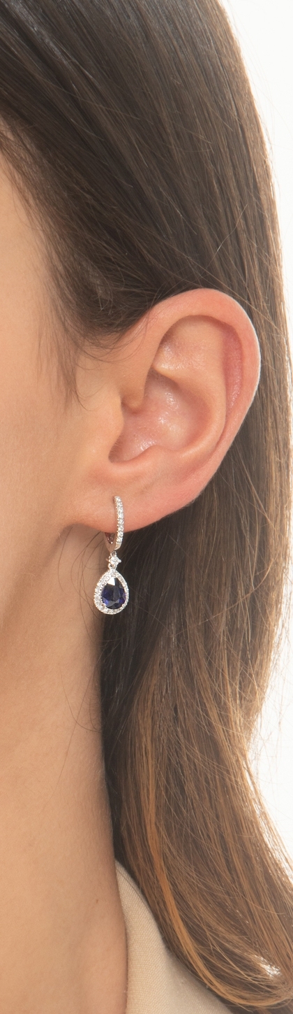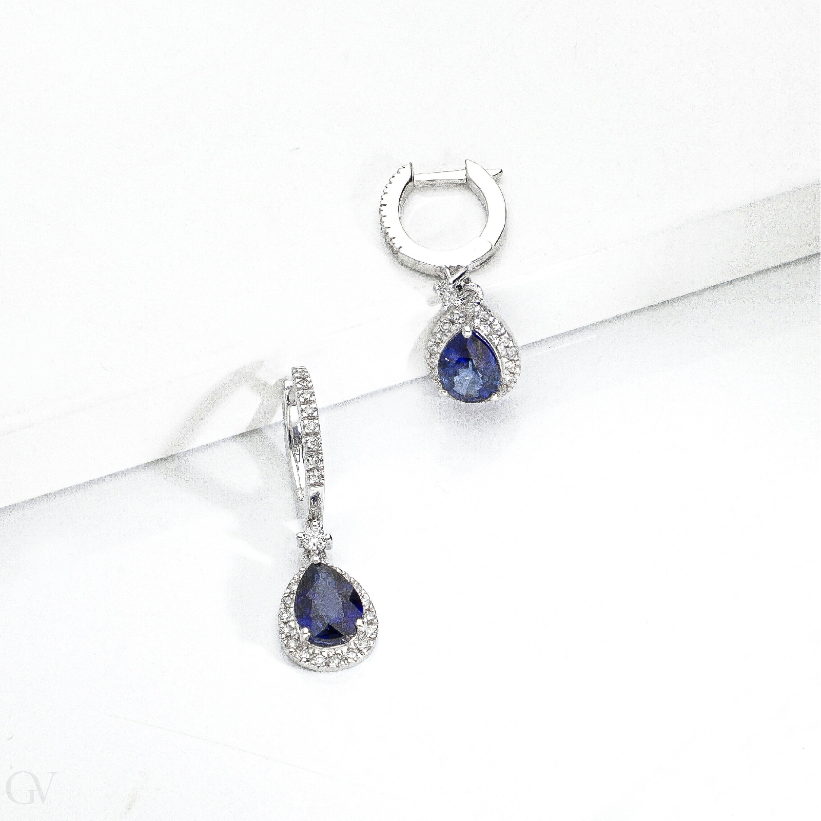 Boucles d’oreilles pendantes or blanc 18K avec saphirs bleus et diamants