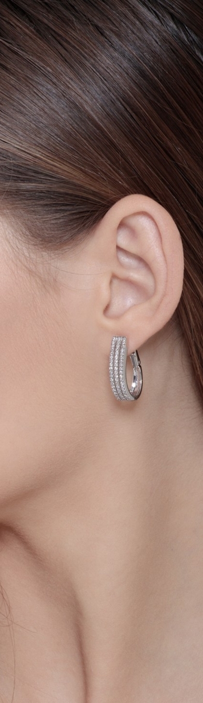 Boucles d'oreilles ovales en or blanc 18k avec triple rangée de diamants taille brillant 0.60 cm, de couleur H et pureté VS. Un éclat raffiné pour un style intemporel.