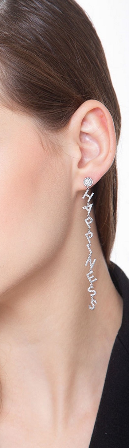 Mono-boucle pendante en or blanc 18 carats, avec le mot HAPPINESS