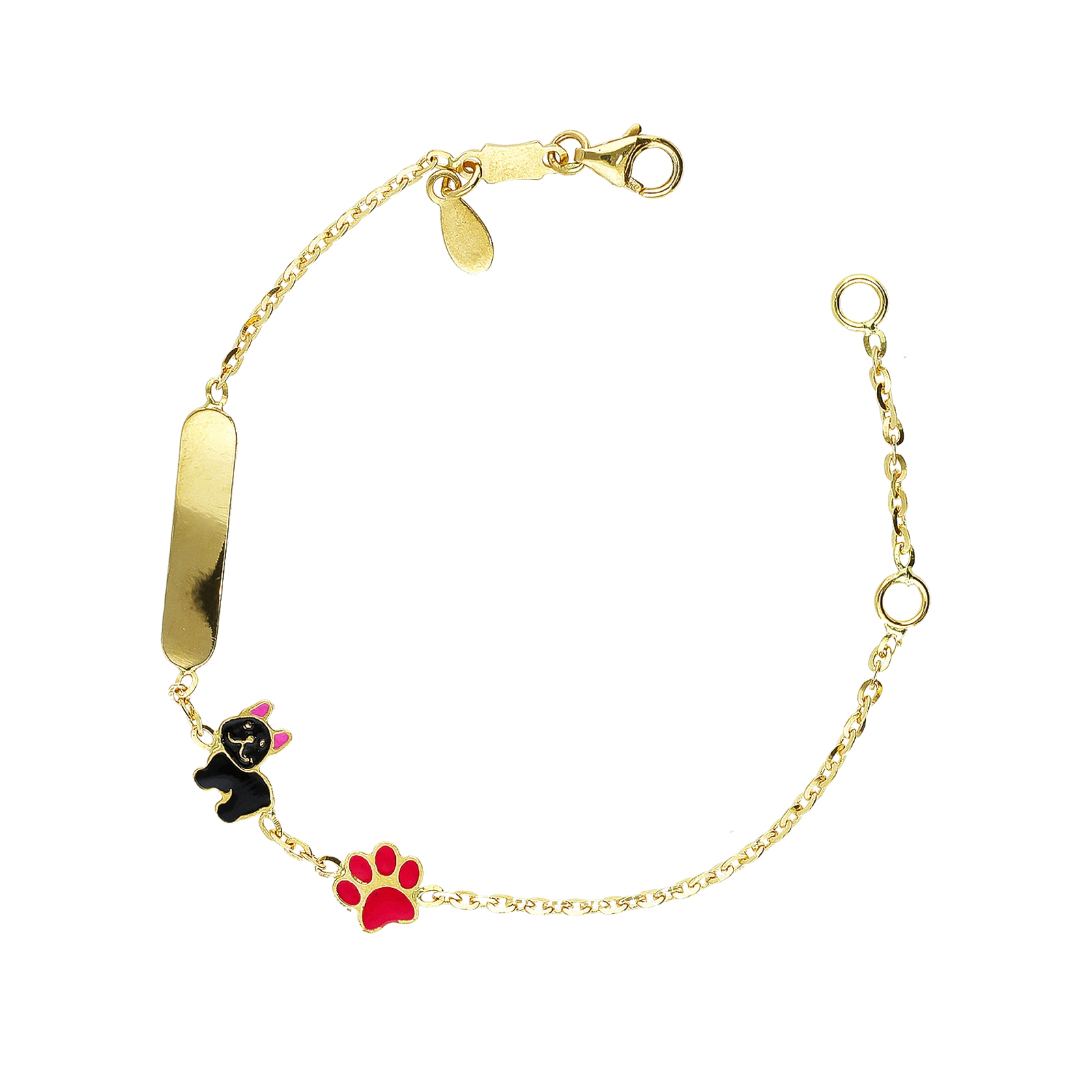 Bracelet en or jaune 18k avec bulldog français, patte et plaque gravable