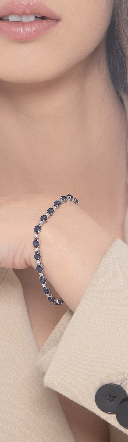 Bracelet alterné en or blanc 18 ct saphirs bleus et diamants, 18 cm