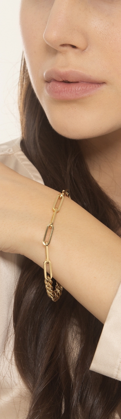 Bracelet gourmette et maillons trombone en or jaune 18k