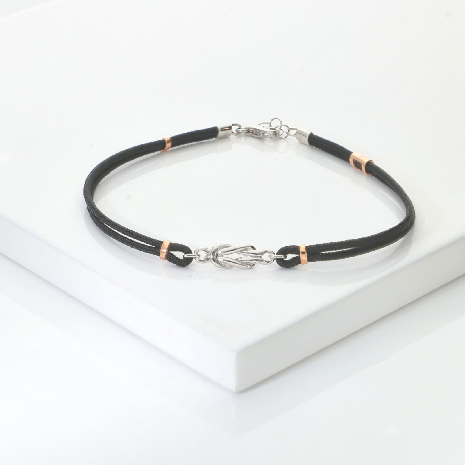 Bracelet tissu noir avec nœud en or blanc et rose 18k