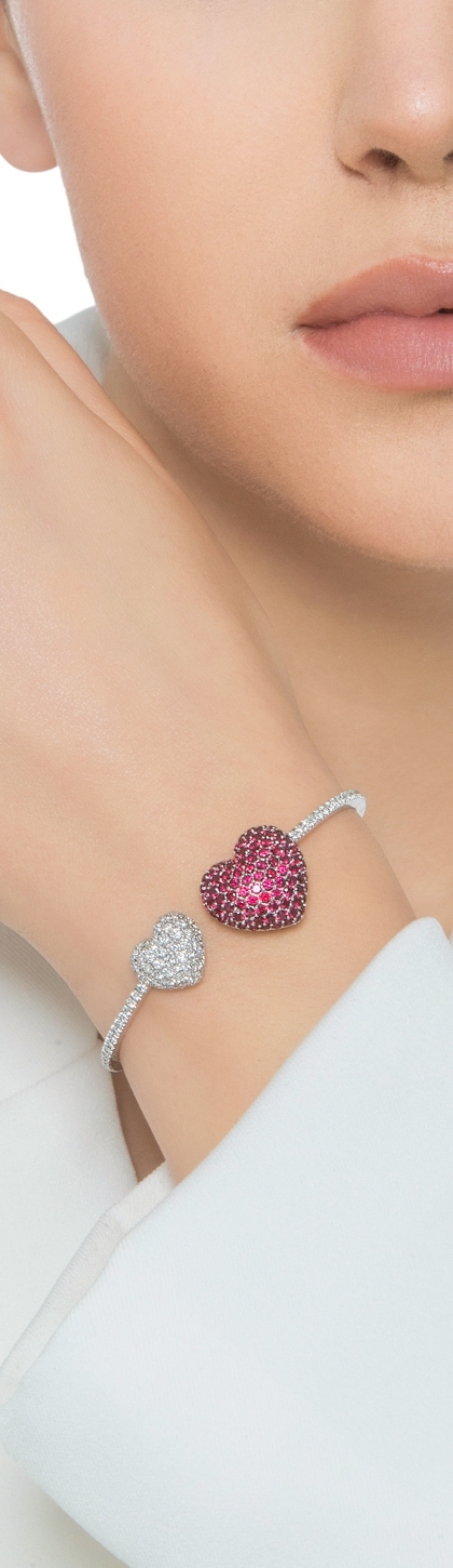 Bracelet or blanc avec deux cœurs en rubis et diamant