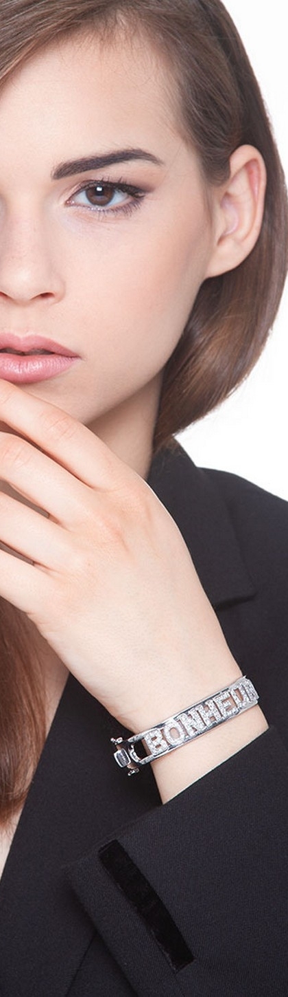 Bracelet rigide avec l'inscription BONHEUR en or blanc 18k