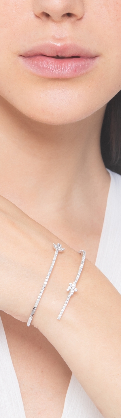 Bracelet semi rigide à ressort en or blanc 18k avec motif floral et diamants